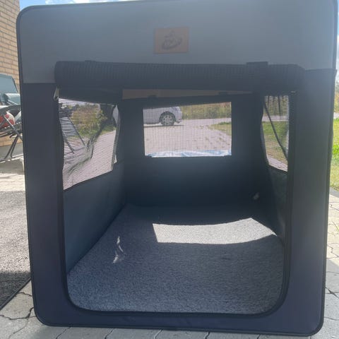 Transportbur til kæledyr. Buret er brugt til en Golden retriever. Buret er fremstillet i aluminium med sorte paneler. Det har 2 døre foran med gitter og en fast top.