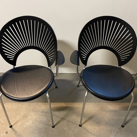 Trinidad stolen er en af Nanna Ditzels alle største succeser. Den er designet i 1993, og har for længst opnået status som en moderne klassiker. Den letgenkendelige stol har fået sit navn, fordi Nanna Ditzel lod sig inspirere af øens traditionsrige løvsavsarbejde. Stolen vandt desuden ID Prisen i 1995. Den gennembrudte finer gør, at Trinidad-stolen næsten opløses i et spil af lys og skygge. Samtidig har stolen en iøjnefaldende og skulpturel karakter. Denne version uden arme kan stables. Trinidad stolen her er i sort ask, sædepolstret i sort-læder