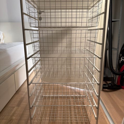 IKEA JONAXEL reol / opbevaringsmøbel / "opbevaringskombination" af metal med fire skuffer af gitter. Kan bruges som indsats i garderobeskab eller fritstående til i soveværelset, i køkkenet, eller på badeværelset, hvor det ikke tager skade af fugt. Vi har skilt det ad, så det er nemt at transportere.