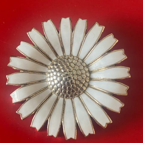 Stor norsk marguerite broche. Emalje på sølv. Vintage 1955-60.