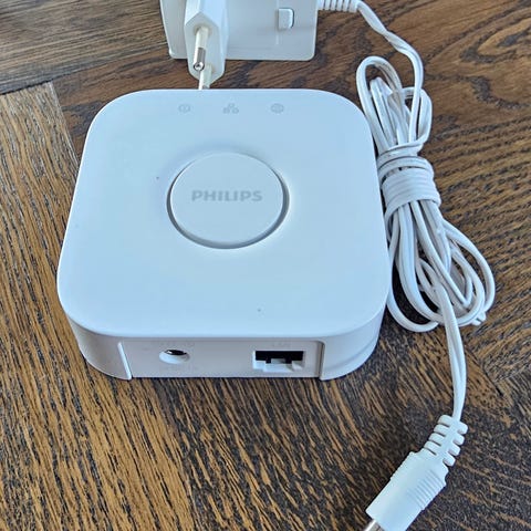 Philips Hue Lyskontrol Hub til styring af Philips Hue lysprodukter. Enheden er hvid og leveres med strømadapter. Bruges til at forbinde og styre smarte lys via Philips Hue systemet.