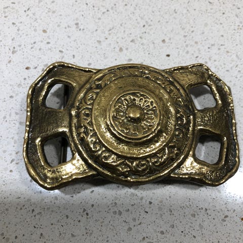10 x 6 cm gedigent lækkert messingspænde til et bælte - let at montere på enhver rem. Pt på sort rem som medfølger.