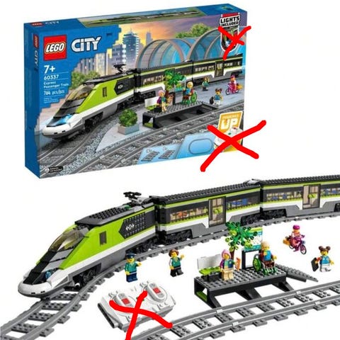 Powered Up elektronik følger IKKE med dvs.: togmotor boogie, batteri hub, fysisk Blue tooth controller, LED lys, som er eventuelt løst tilkøb.