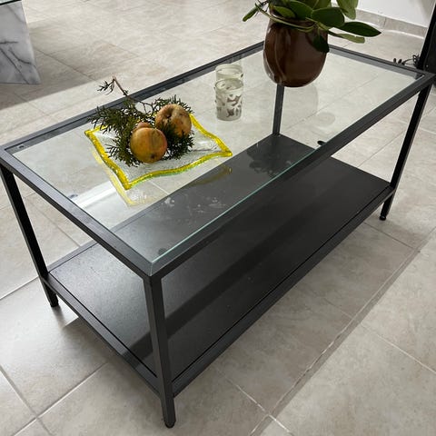 IKEA Granas glass-top coffee table with a black metal frame