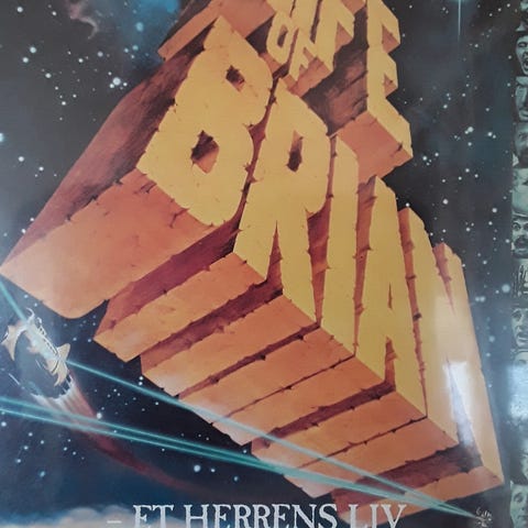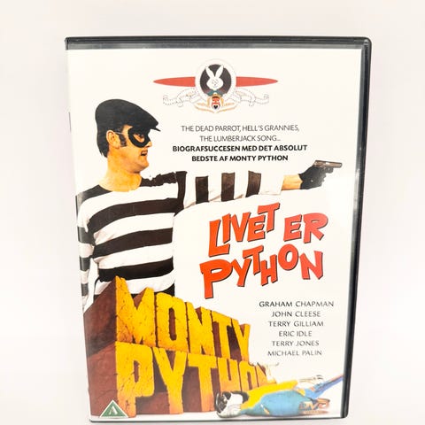 Monty Python Life of Brian DVD med filmens cover og bagsideillustration. DVD'en indeholder filmen Life of Brian, en komediefilm af Monty Python.