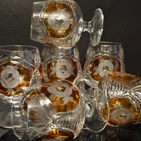 Tallerkenen viser blide tegn på alder, hvilket tilføjer ægte vintage charme uden at påvirke funktionaliteten eller skønheden. Glassene er i fremragende stand, lyse og gennemsigtige. Et distingveret dekorativt og funktionelt sæt — perfekt til servering af drikkevarer med tidløs fransk elegance.