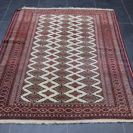 Oprindelse Rusland, model Türkmen Buchara Art Deco tæppe, 205 cm lang og 135 cm bred, uld på uld. Klik på den blå "gå til varen" knap, for at købe eller byde på denne vare. Den samlede pris vil blive vist inden du afgiver dit bud.