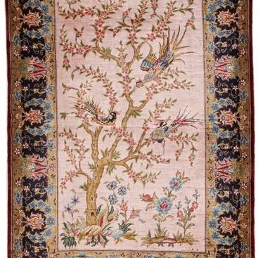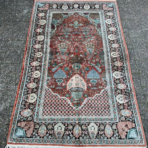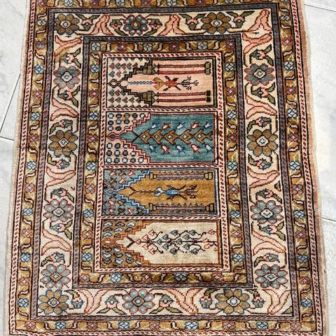 Et midt-20. århundredes rene silketæppe fra Türkiye, Istanbul-Cinar, model Pure Silk Turkish Istanbul-Cinar Carpet With Signature, måler 129 x 92 cm, i meget god stand, professionelt renset, Mehrab-design, omkring 640.000 knuder pr. m². Klik på den blå "gå til varen" knap, for at købe eller byde på denne vare. Den samlede pris vil blive vist inden du afgiver dit bud.