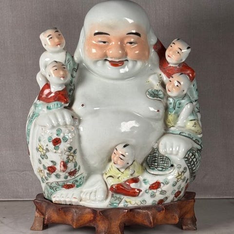 Marmorkvind Buddha i Mandalay-stil fra Burma, udskåret i marmor, højde 31 cm, bredde 24 cm, dybde 23 cm, dateret 1850–1900, monteret på en rød base og i god stand med fastgjort finial. Klik på den blå "gå til varen" knap, for at købe eller byde på denne vare. Den samlede pris vil blive vist inden du afgiver dit bud.