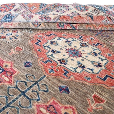 Elegant, håndknyttet designer-tæppe fra Pakistan med klassisk Kazak-mønster. De kraftige farver og de detaljerede geometriske motiver giver ethvert rum en varm og traditionel atmosfære.