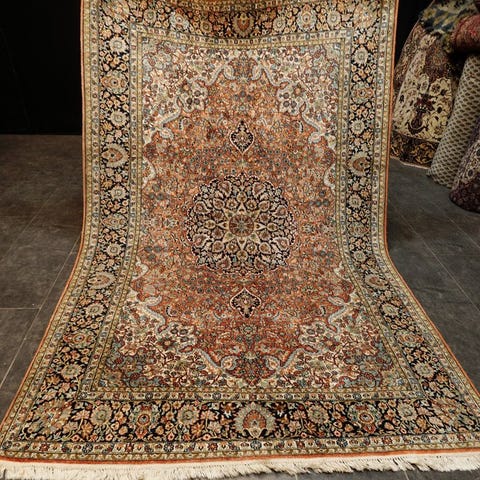 Der tilbydes et håndknyttet kasmir-silke orientalsk tæppe.