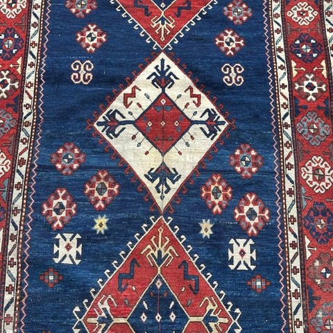 Shirvan tæppe, 165 x 144 cm, håndvævet i Rusland, uld på bomuld, tidligt 20. århundrede (cirka 1920), flerfarvet med rige naturlige farver, generelt i god stand med spor af ældning og brug, professionelt renset. Klik på den blå "gå til varen" knap, for at købe eller byde på denne vare. Den samlede pris vil blive vist inden du afgiver dit bud.