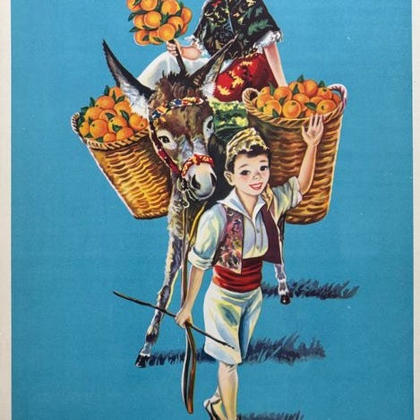 Smuk samling af 70 små Spanien plakater med appelsiner - År 1930-1940-1950-1960.