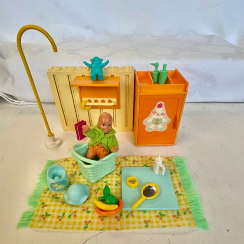 LEGO Scala sæt 3152, Legeværelse Baby. Indeholder de dele som er vist på billedet, inklusive møbler, babyfigur og tilbehør.