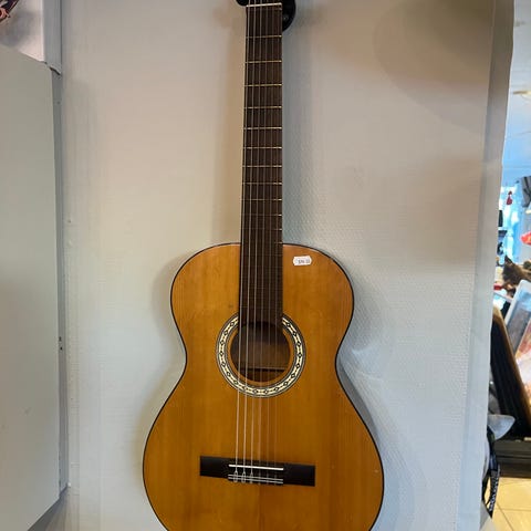 Akustisk guitar i naturfarvet træ med seks strenge. Guitarens krop og hals er lavet af træmateriale. Medfølgende sort blød taske til transport og opbevaring.