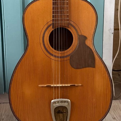 Henry Müller seksstrenget cutaway-guitar, fremstillet i Frankrig omkring 1930, i god brugt stand og testet funktionsdygtig; længde 107 cm, bredde 41 cm, højde 11 cm, vægt 1850 g, træsorter: ahorn, fichte og valnød. Klik på den blå "gå til varen" knap, for at købe eller byde på denne vare. Den samlede pris vil blive vist inden du afgiver dit bud.