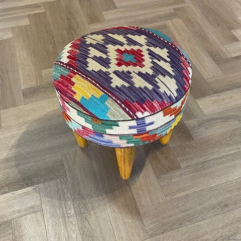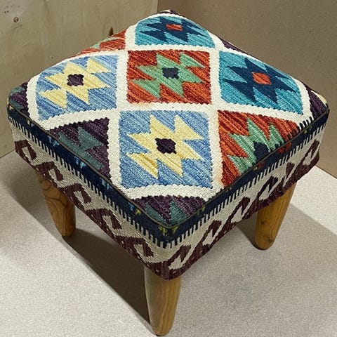 Denne unikke håndvævede kelim-puf er lavet af autentisk kelimtekstil, omhyggeligt udvalgt og håndlavet af erfarne håndværkere. Puden kombinerer traditionelle væveteknikker med tidløse mønstre og naturlige farver. Takket være den solide polstring tilbyder den behagelig siddekomfort, mens det vævede overflade tilføjer et luksuriøst, håndværksmæssigt udseende til dit interiør. Perfekt som stilfuldt boligtilbehør, ekstra siddeplads eller subtil blikfang i en boheme, eklektisk eller moderne indretning.