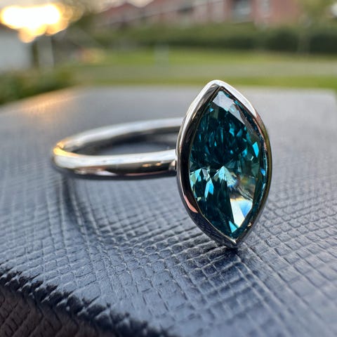 Det er monteret på en stilfuld og tidløs, håndlavet 18K massivt hvidguld ring med prong- og paveindstilling, hvor 28 topkvalitets, ildfulde diamanter omgiver for at fremhæve størrelsen, formen