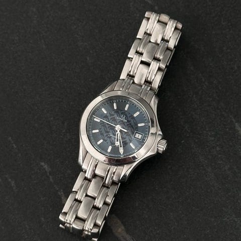 Omega Seamaster quartz damemodel, reference 2577.80, stål kasse på 29 mm i diameter, blå urskive, stålrem (tilpasser til håndled op til 15 cm) med foldelukning, ingen æske eller papirer, meget god stand med mindre brugsspor. Klik på den blå "gå til varen" knap, for at købe eller byde på denne vare. Den samlede pris vil blive vist inden du afgiver dit bud.
