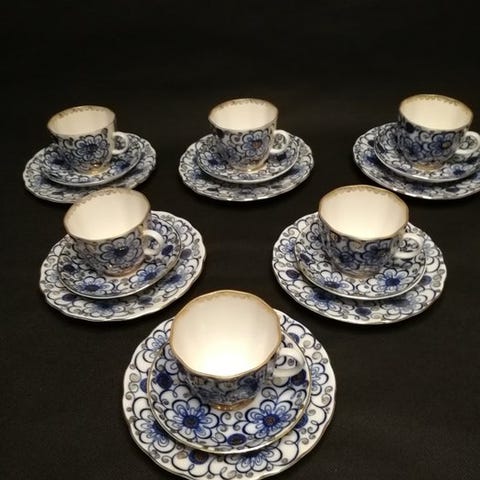 6 tallerkener fra Lomonosov Imperial Porcelain Factory med det berømte Cobalt Net-design i perfekt stand, aldrig brugt. Diameter 18 cm. Håndmalet med 22 karat guld.