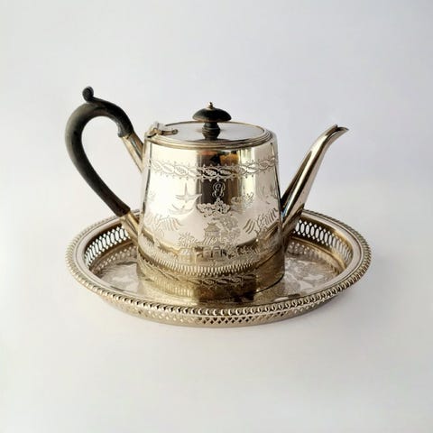 Tre-delt sølvbelagt tesæt, som inkluderer en tekande, en mælkekande og en sukkerskål.