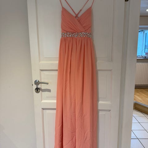Gallakjole, str. S, Laksefarvet, Satin, Lang laksefarvet kjole med lille slæb og blonder på ryggen.