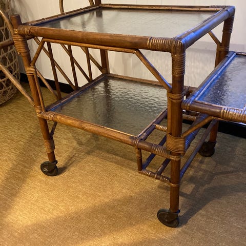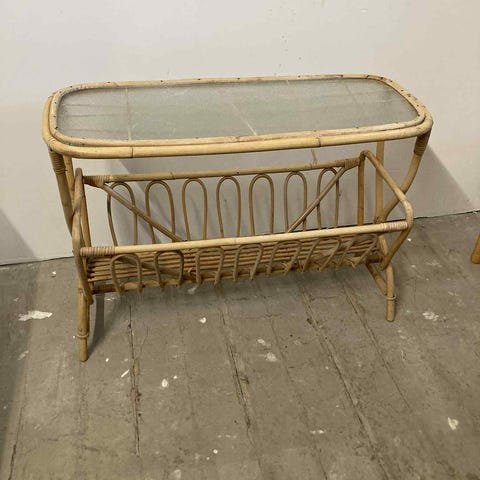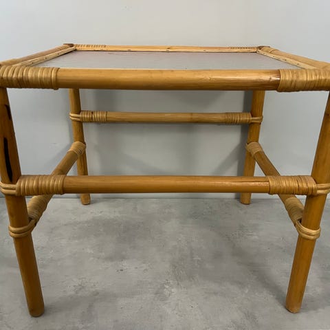 Rattan bambusbord med glasplade, velegnet som sidebord eller til opbevaring. Bordet har en naturlig finish og er fremstillet i flettet rattan og bambus, med en gennemsigtig glasoverflade på toppen.