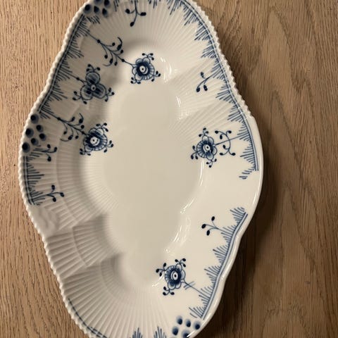 Royal Copenhagen Musselmalet Riflet serveringsfad i porcelæn med blåmalet mønster. Fadet har en oval form med riflet kant og detaljerede blå blomsterdekorationer. 38,5 cm, 1. Sortering. Nypris 2250 kr