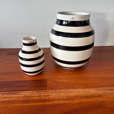 Kähler keramikvaser med stribet mønster i sort, hvid og beige. Sættet indeholder vaser i forskellige størrelser, alle med rund form og blank finish. Velegnet til dekoration og blomsterarrangementer.