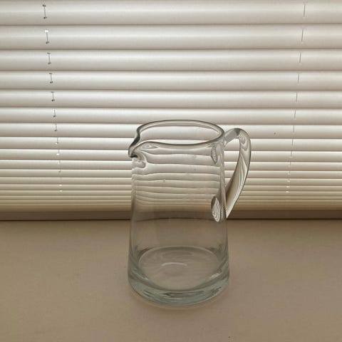 Glas kande med klar overdel og blå bund. Kanden har et stort håndtag og en hældetud. Den er fra Jerpoint Glass, håndpustet og helt ubrugt.