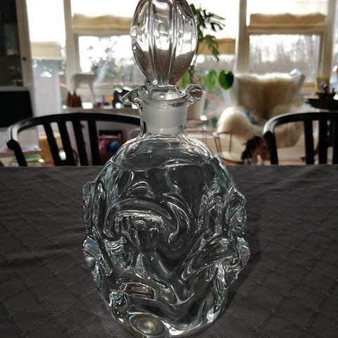 Karaflen i klart krystalglas, elegant, langstrakt form med rund prop. Også velegnet til vase. Kan også hentes i København.