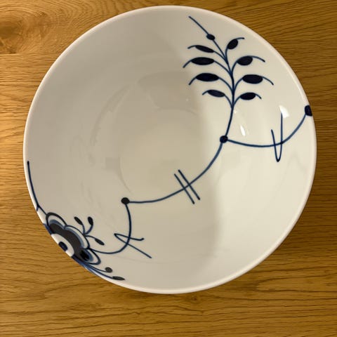 Royal Copenhagen Blue Fluted Mega skål i porcelæn. Skålen har et klassisk blått blomsterdesign og er velegnet til servering og opbevaring af mad.