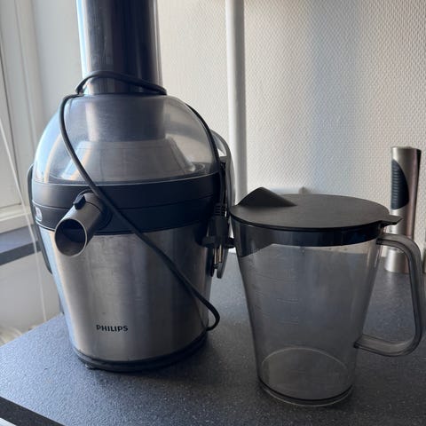 Philips HR1871 juicemaskine i rustfrit stål med tilbehør til juicepresning. Maskinen har en stor påfyldningsrør og en beholder til opsamling af juice. Virker fint får den bare ikke brugt.