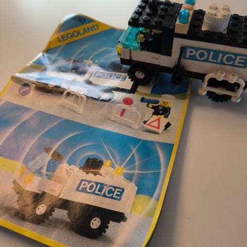 Fin Politi efterforsknings bil. Alt er der bortset fra at det ikke er de originale planter og det røde blinklys på bilen er to 1x2 klodser i stedet for 1x4. Alle figurer og manual er der.