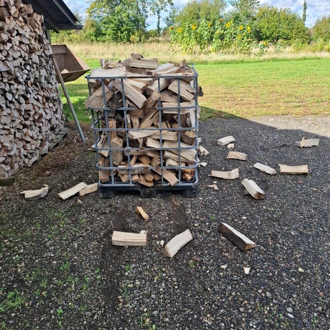 Kløvet brænde ca. 30-40 cm. Tørt og klar til at fyre med. Opbevares inde og buret medfølger ikke.