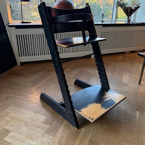 Stokke højstol designet til børn. Fremstillet i sort træ med justerbar sidde- og fodplade for tilpasning til barnets størrelse.