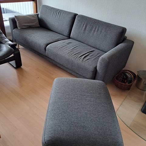 Pæn 3 personers sofa, inklusiv puf, er i god stand. Hynderne er aftagelige /ikke-ryger - kæledyrsfrit hjem. Pufmål: 90/60/47 cm. Skal afhentes, Mobilepay