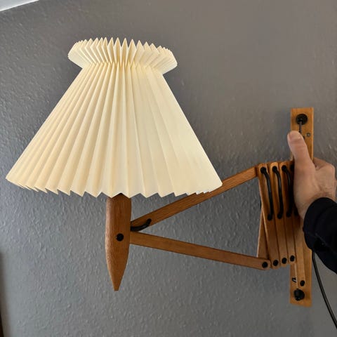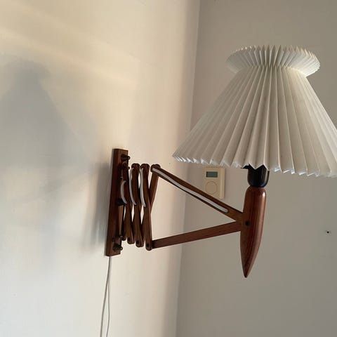 Stor Le klint sakselampe i teaktræ og med sort stofledning.