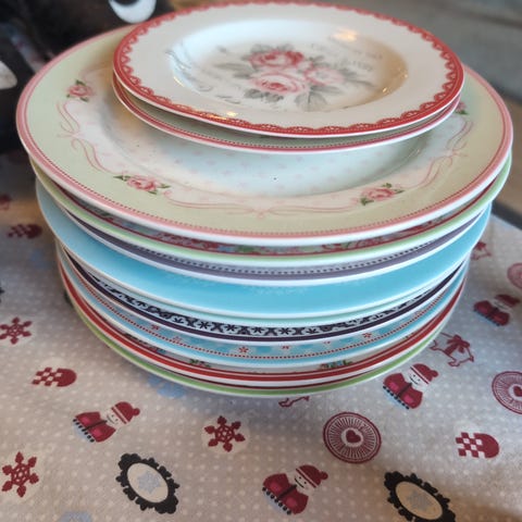 Frokosttallerken, Middagstallerken lille, Sidetallerken, Salattallerken, Kagetallerken stor