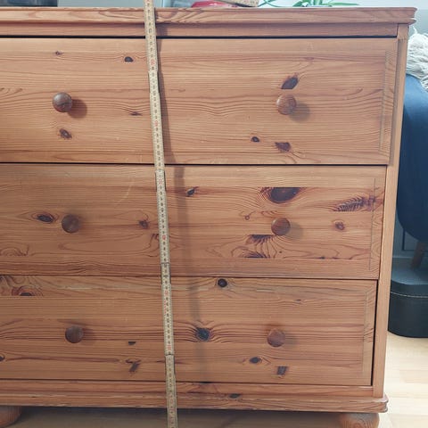 Hyggelig, rummelig fyrretræs kommode med 3 skuffer - lidt slidt på toppen, men hvis man har tanker om at upcycle den alligevel, så er det godt træ som kan slibes og males....