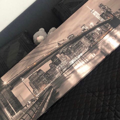 Vægdekoration med motiv af New York City skyline i sort-hvide og gyldne nuancer. Passer til indretning i stuer, kontorer eller andre rum, hvor bybilleder ønskes.