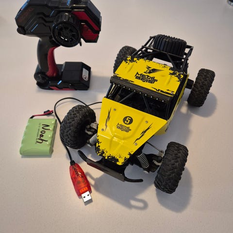 QuakeShock Radiostyret fjernstyret monstertruck med blå og sort farve. Leveres med fjernbetjening og et genopladeligt 7,4V 1500mAh Li-ion batteri. Designet til off-road kørsel med store dæk og robust konstruktion.