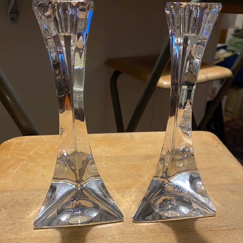 Et par klare glaslysestager med en moderne og geometrisk design. Lysestagerne er trekantede ved bunden og strækker sig op til en lige, smal top, der giver en stilfuld og elegant look. De er ideelle til at holde taperede lys og vil tilføje et sofistikeret touch til ethvert hjem.