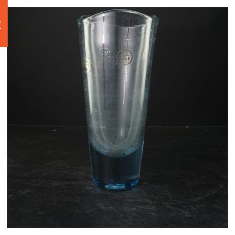 Denne vase er lavet af glas med en dekorativ blå kant og klare detaljer. Den har en højde på 18 cm og en diameter på 7,5 cm. Vasen har et indsnævret midterparti og et mønstret design, som kan ses fra forskellige vinkler på billederne. Den er ideel til at holde mindre blomster eller som en dekorativ genstand i hjemmet.