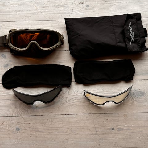 Dette sæt indeholder to udskiftelige linser; en klar og en gul linse, perfekt til forskellige lysforhold. De kommer med en sort opbevaringstaske med lynlås og en karabinhage for nem fastgørelse. Taskens logo viser 'Wiley X.' Der er også en sort snor til sikker fastholdelse af brillen omkring nakken.