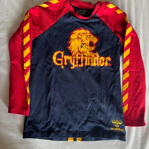 Sæt bestående af en langærmet bluse og bukser, begge i mørkeblå farve. Blusen har et Hogwarts emblem og teksten 'HOGWARTS' trykt foran i gul. Bukserne er ensfarvede uden tryk. Sættet er i størrelse 152.