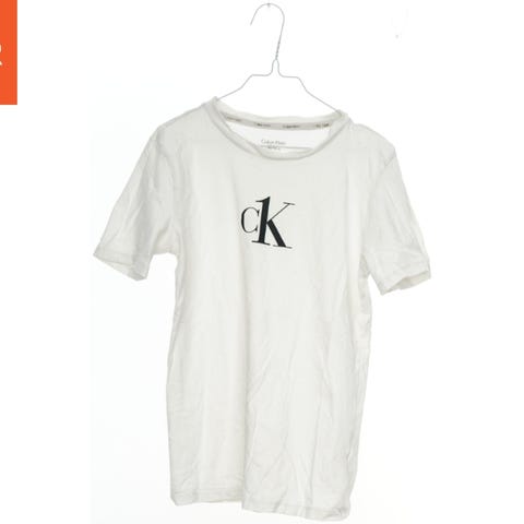 Orange t-shirt med kort ærme og rund halsudskæring. På forsiden af t-shirten er der et stort tryk med 'CK' og teksten 'CALVIN KLEIN JEANS' i sort og hvid. Bagsiden af t-shirten er simpel uden mønster eller tryk.