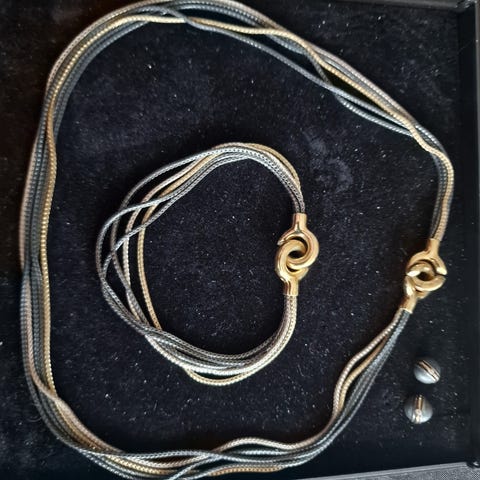 Anytime Smykkesæt bestående af materialer i finsølv og 21 karat guld. Designet til kvinder. Sættet inkluderer et halskæde og et par ørerstikkere i 8 karat. Smykkerne leveres i original emballage.