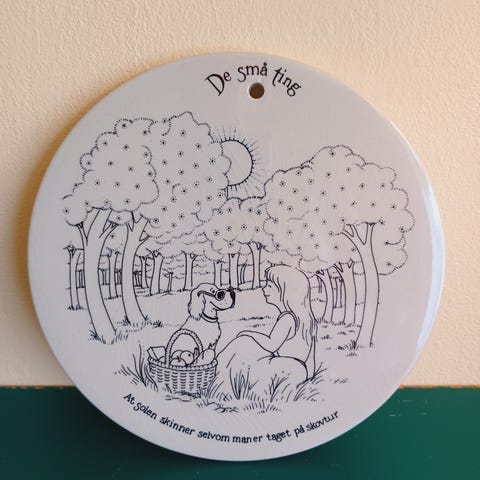 Dette er en keramisk platte med en diameter på 10 cm, produceret af Lovemose, Danmark. Platte er blå med en mørkere kant og har et indgraveret mønster langs kanten. Undersiden er stemplet med 'Lovemose Made in Denmark'.