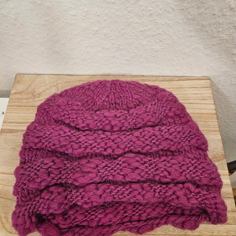 Dette er en strikket hue i en dyb rød farve, der har tre sorte knapper foran. Huen har en diameter på Ø 23 cm. Den er designet til at være komfortabel og varm, ideel til koldere vejr.